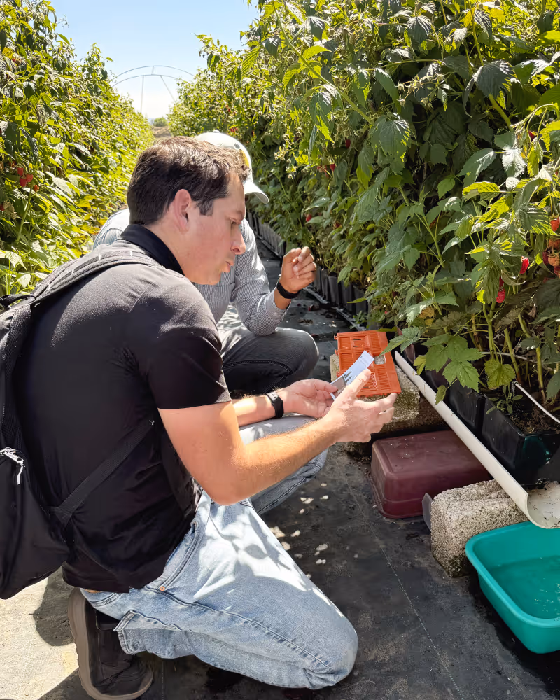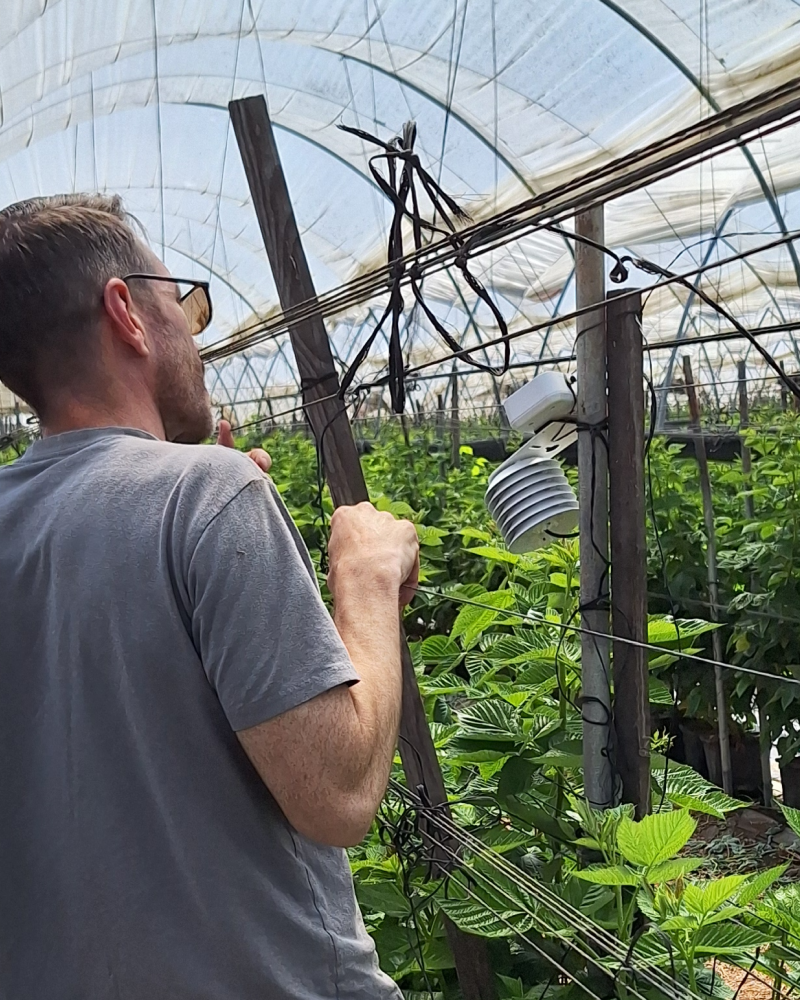 Scott Campbell, Addium Chief Technical Officer, installing a TEROS ONE sensor in a raspberry plant.